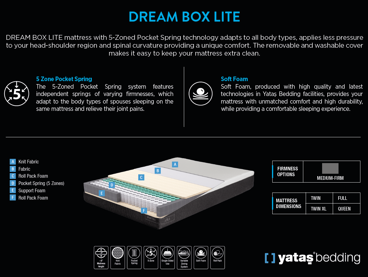 Introducing the YATAS Dream Box Lite mattress, a culmination of advanced features meticulously engineered to redefine your sleep experience. Wrapped in luxurious knitted fabric, this mattress boasts a lavish touch that enhances both comfort and aesthetics.